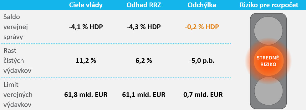 - Podľa RRZ deficit v aktuálnom roku dosiahne 4,3 % HDP (6,2 mld. eur), za predpokladu, že vláda neprijme dodatočné opatrenia. Negatívna odchýlka od rozpočtového cieľa vlády dosahuje 0,2 % HDP (312 mil. eur), čo znamená stredné riziko pre splnenie schváleného rozpočtu.